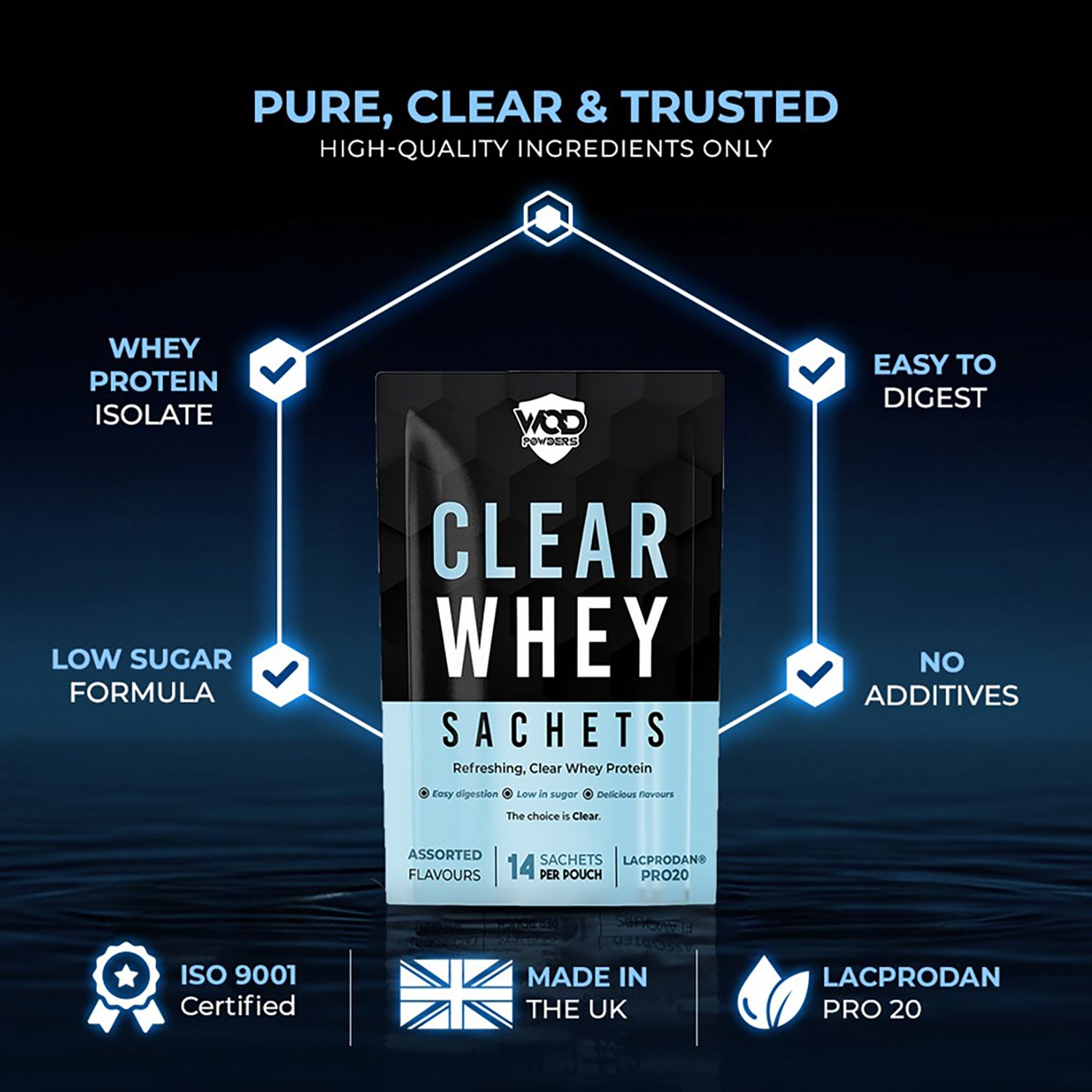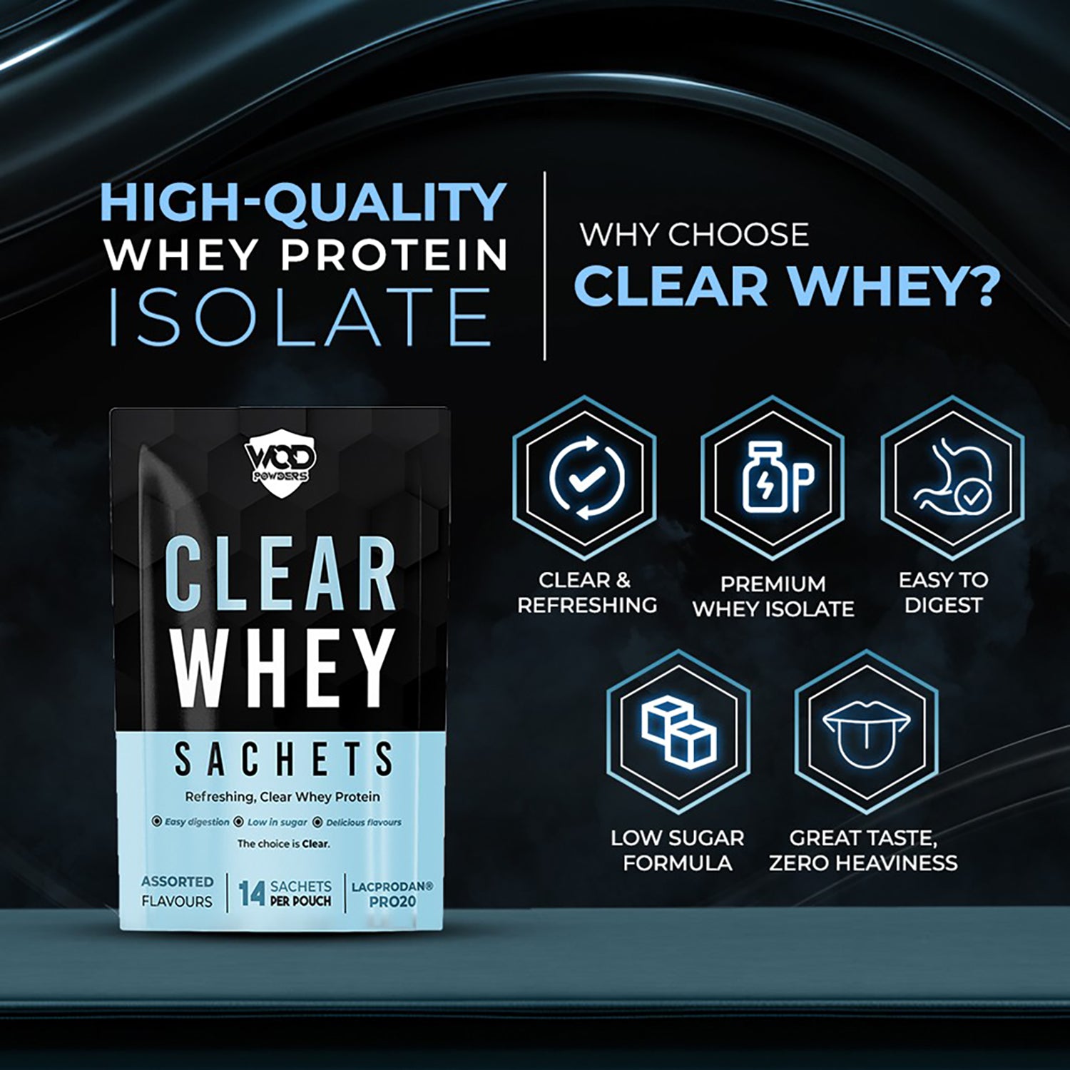 Discover a lighter way to hit your protein goals with WOD Powders Clear Whey Sachets. Made with premium whey protein isolate (Lacprodan® PRO20), this refreshing formula mixes into a clear, juice-like drink that’s easy to digest and perfect post-workout or on the go.